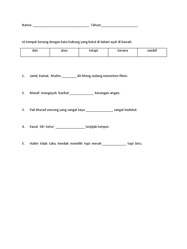 Lembaran Kerja Bahasa Melayu Pendidikan KhasAktiviti pembelajaran berteraskan bahasa melayu membolehkan murid memberi respons secara bertatasusila terhadap pelbagai bahan. Kemahiran bertutur online worksheet for TAHUN 2. Jadikan latihan simpulan bahasa tahun 2 KSSR ini sebagai satu perbincangan yang menarik untuk memastikan masa berkualiti dapat dihabiskan bersama anak-anak.